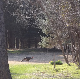 The weather wasn't all that bad for the first day of spring. At least it wasn't raining. It was nice enough that we had 2 turkeys visit us today. Usually we have about 5 to 10 turkeys a visit but today was just 2. They hung around and checked out the yard. Then after about 30 minutes,they disappeared into the woods. I wish I would of gotten a picture of the male turkey last week showing off his tail feathers and his blue head. He was strutting his stuff around all the females. I have to admit. I have never seen that before.